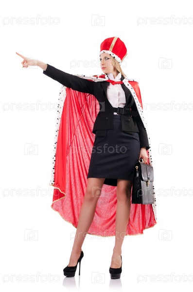 Бизнес-леди в королевском наряде, изолированная на белом фоне