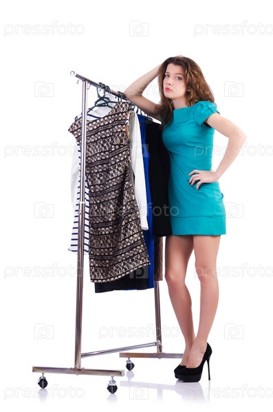 Женщина примеряет новую одежду на белом фоне
