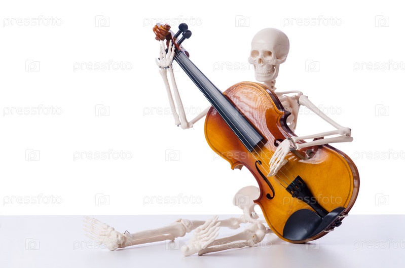 Скелет играет на скрипке, изолированный на белом фоне