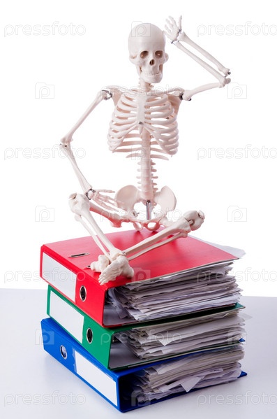 Скелет с стопке папок на белом фоне