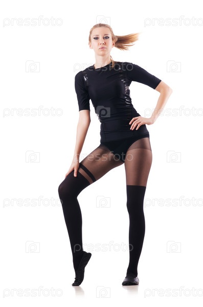 Молодая женщина танцует на белом фоне