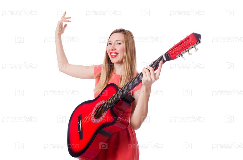 Женщина играет на гитаре, изолированная на белом фоне