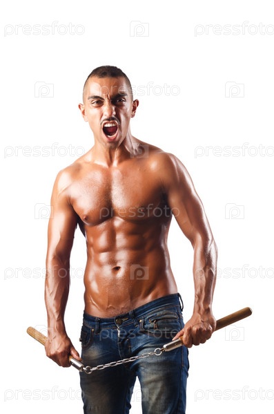 Мужчина с нунчаками в концепции боевых искусств