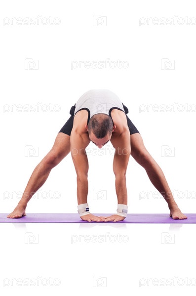 Мужчина делает упражнения на белом фоне