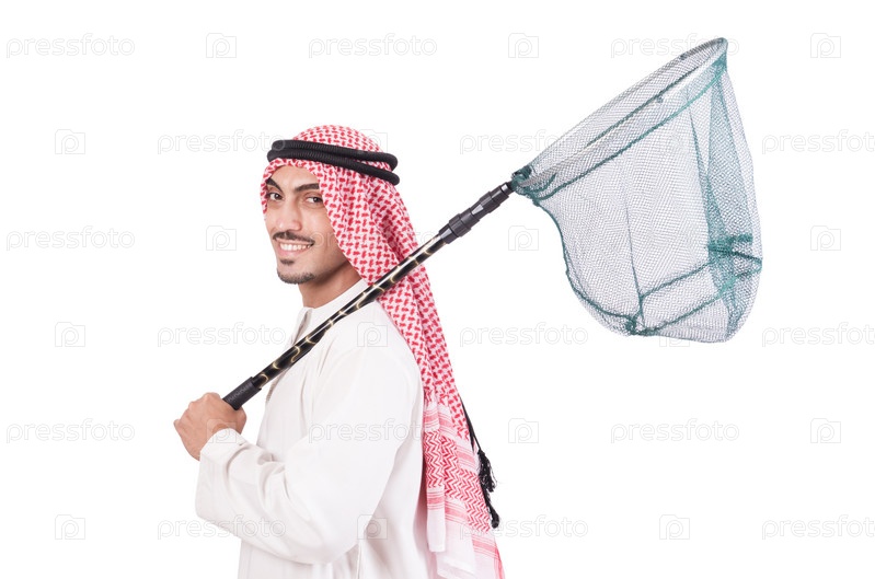 Арабский бизнесмен с сачком на белом фоне