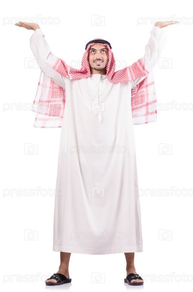 Арабский бизнесмен толкает что-то, изолированный на белом фоне