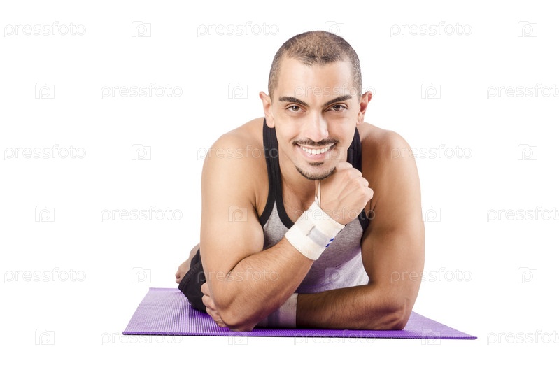 Мужчина делает упражнения на белом фоне