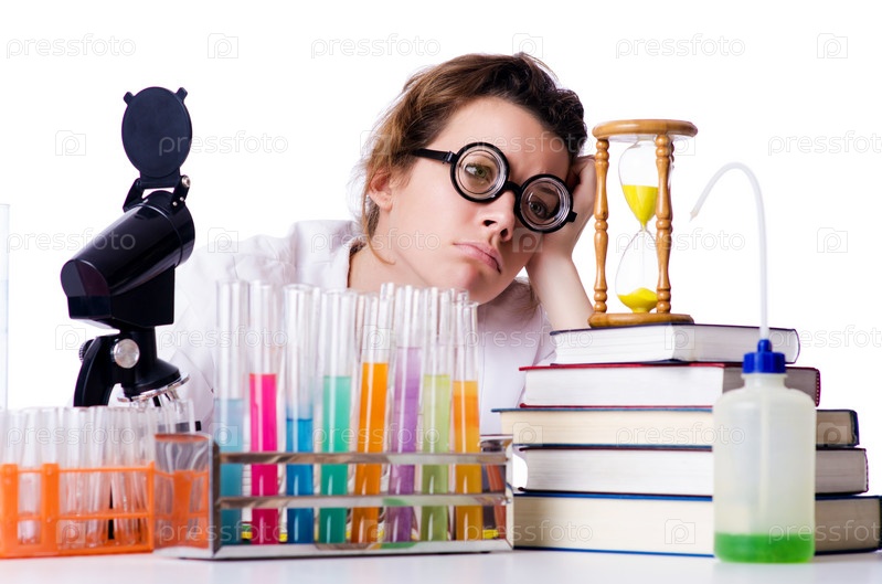 Задумчивая девушка-химик в лаборатории
