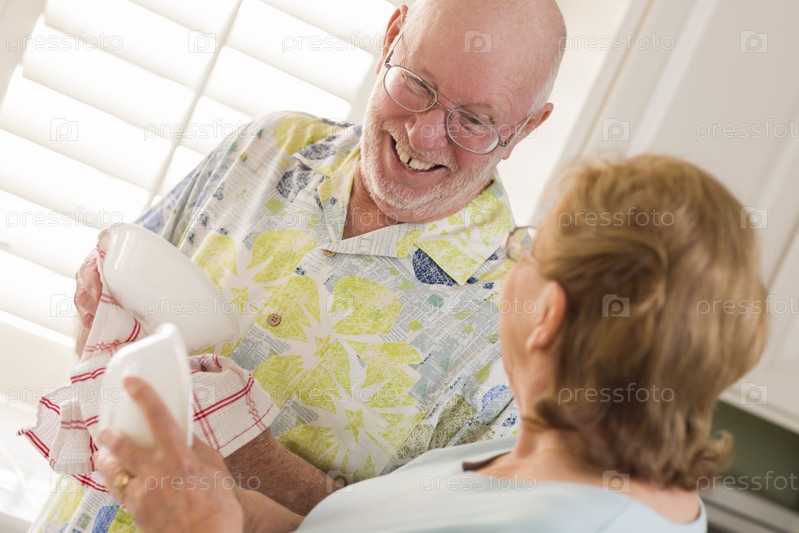 Пожилая пара моет посуду вместе на кухне