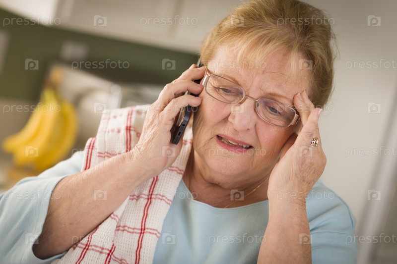 Шокированная пожилая женщина говори по мобильному телефону на кухне