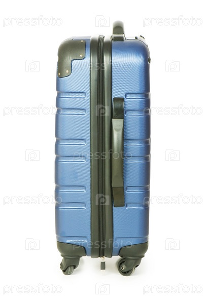 Голубой дорожный чемодан на белом фоне