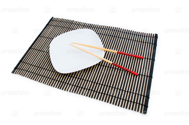 Китайские палочки на бамбуковой циновке на белом фоне