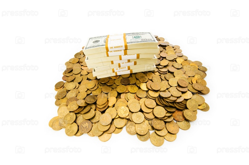 Монеты и бумажные купюры на белом фоне