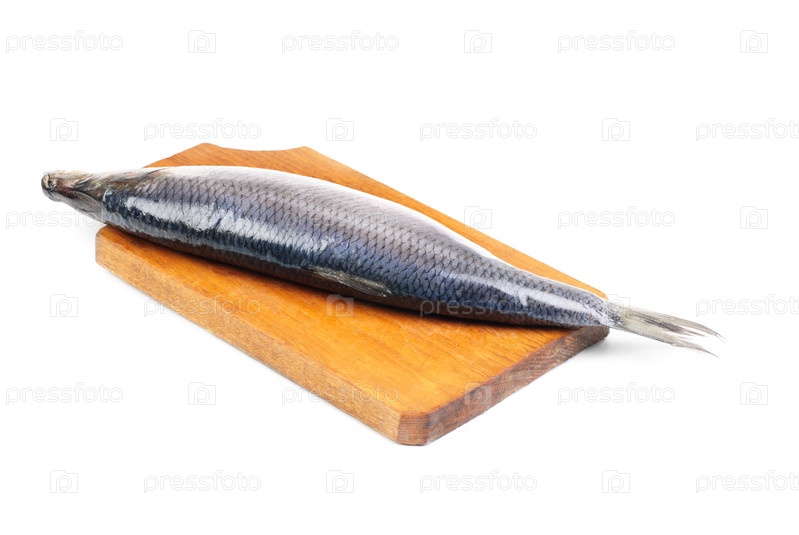 Сельдь на деревянной доске на белом фоне