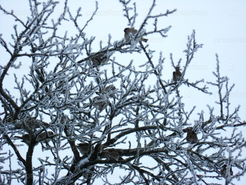 Стайка воробьев на дереве с инеем