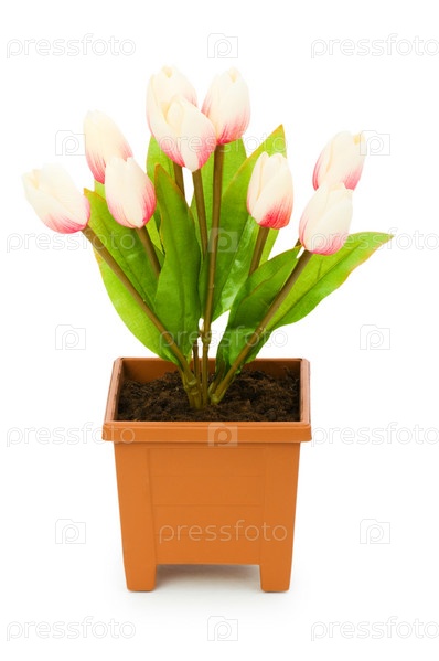 Горшок с тюльпанами, изолированный на белом