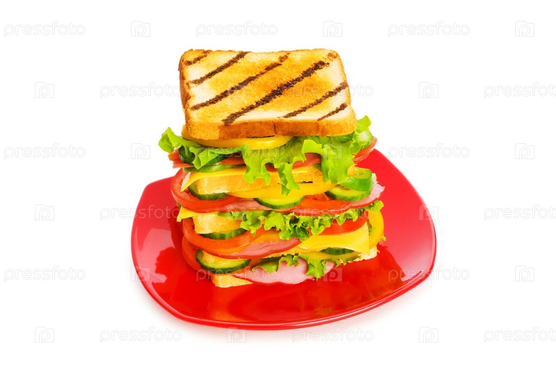 Большой бутерброд на тарелке на белом фоне