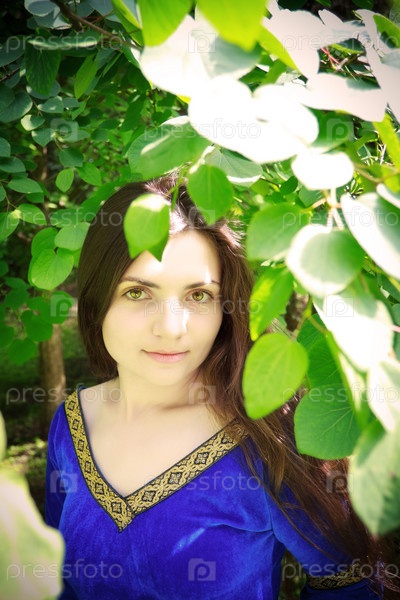 Девушка в синем платье под деревом