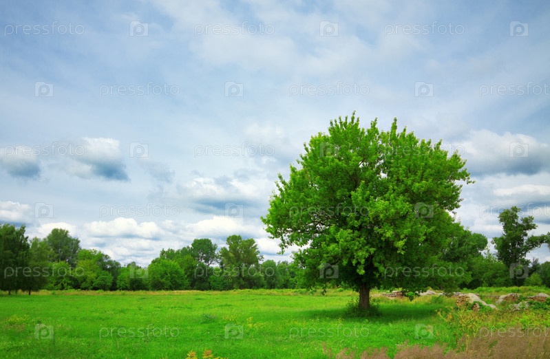 Зеленое одинокое дерево на лужайке