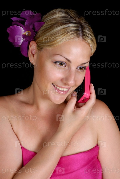 Блондинка разговаривает по телефону, изолированная на черном фоне