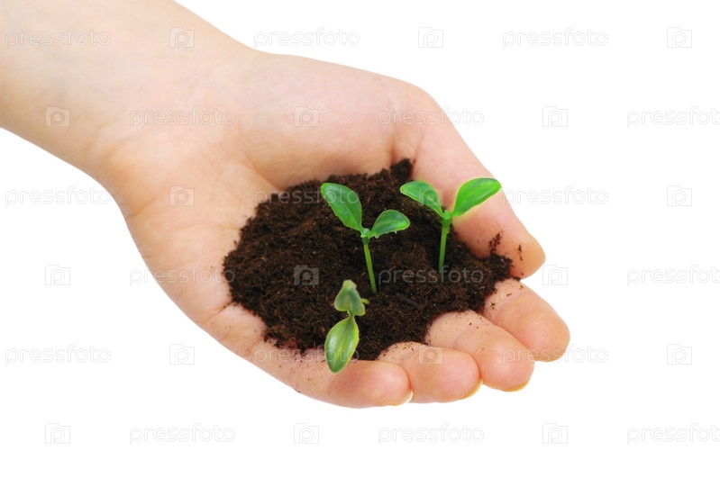 Молодые саженцы в руке на белом фоне