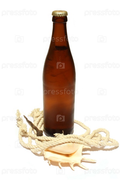 Бутылка пива, веревка, гвоздь на белом фоне