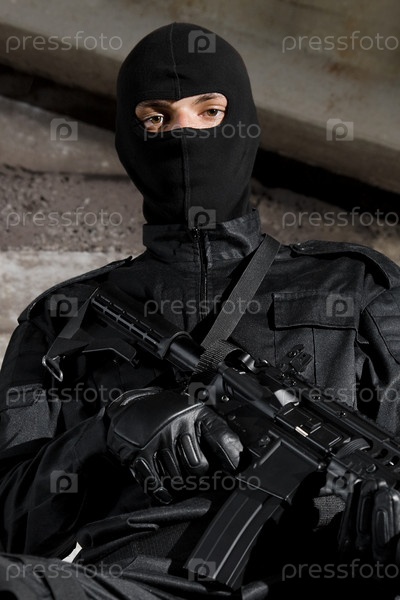 Человек в черном военном камуфляже держит автоматическую винтовку М-4