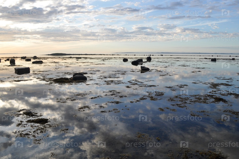 Закат на Белом море (Соловецкие острова, остров Большая Муксалма). Справа виден остров Анзер