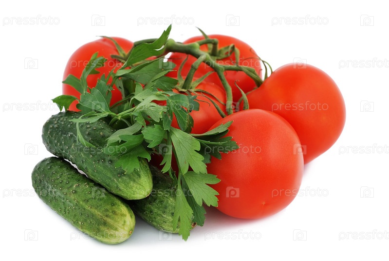 Помидоры, огурцы, петрушка на белом фоне