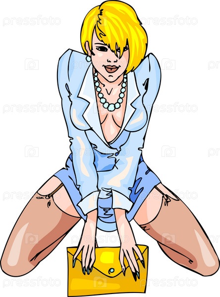 Блондинка в голубом костюме и чулках