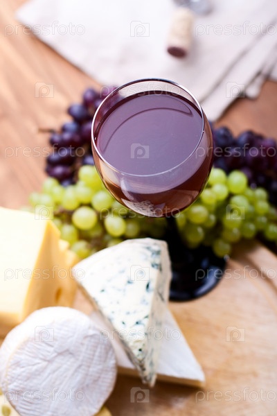 Разные виды сыров, бокал вина и гроздья винограда