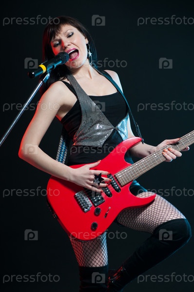 Выразительная женщина играет на электрической гитаре и поет на темном фоне