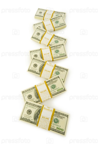 Пачки стодолларовых купюр на белом фоне