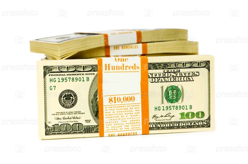 Пачки стодолларовых купюр на белом фоне