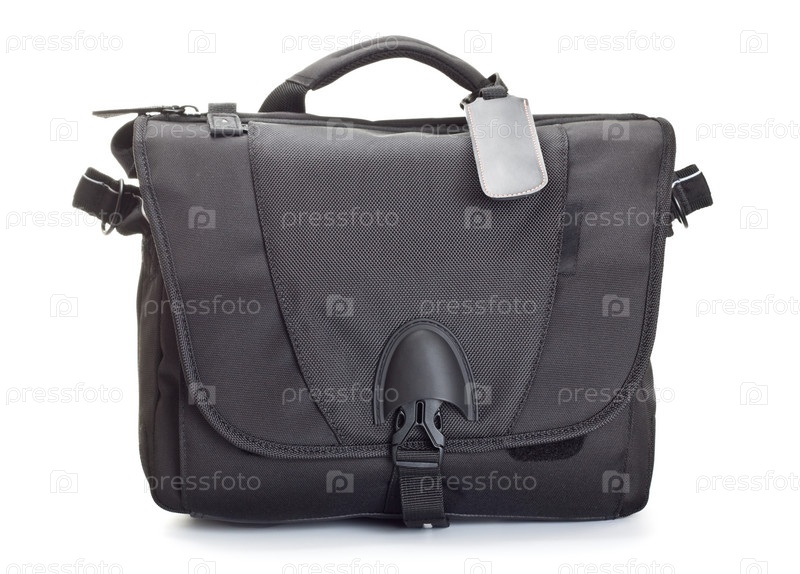 Черная сумка для фото аксессуаров на белом фоне