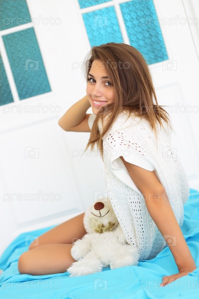 Красивая девушка с медвежонком в спальне