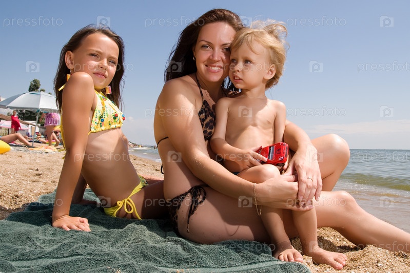 Мама и ее дети наслаждаются отдыхом на песчаном пляже