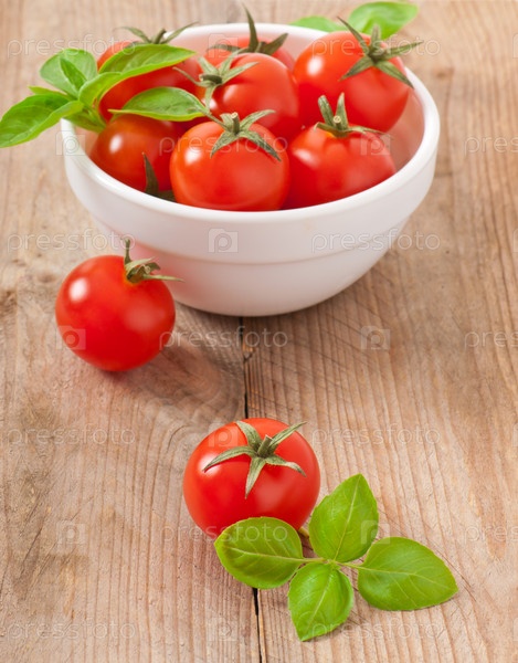 Помидоры черри в миске с базиликом