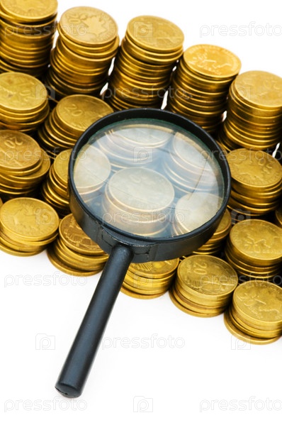 Увеличительное стекло и монеты