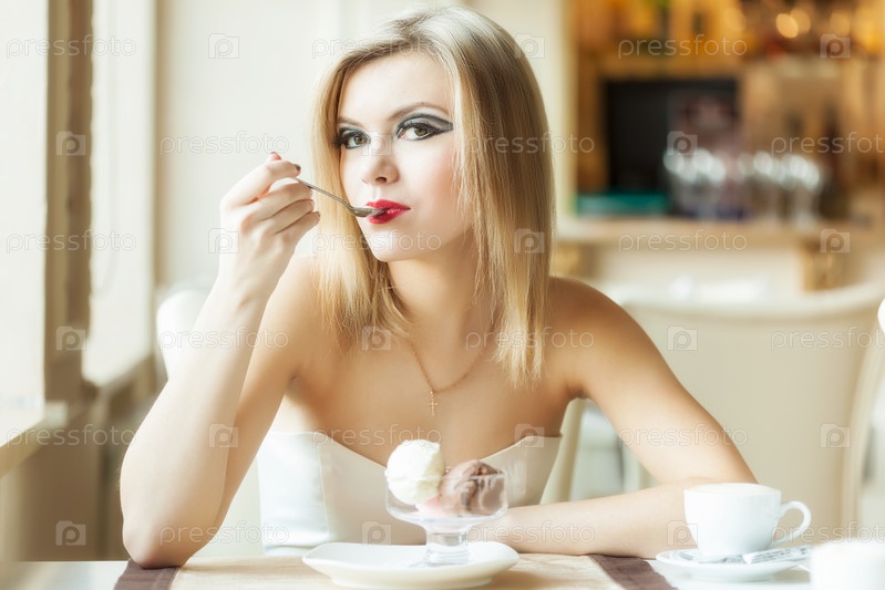 Женщина в ресторане ест мороженое