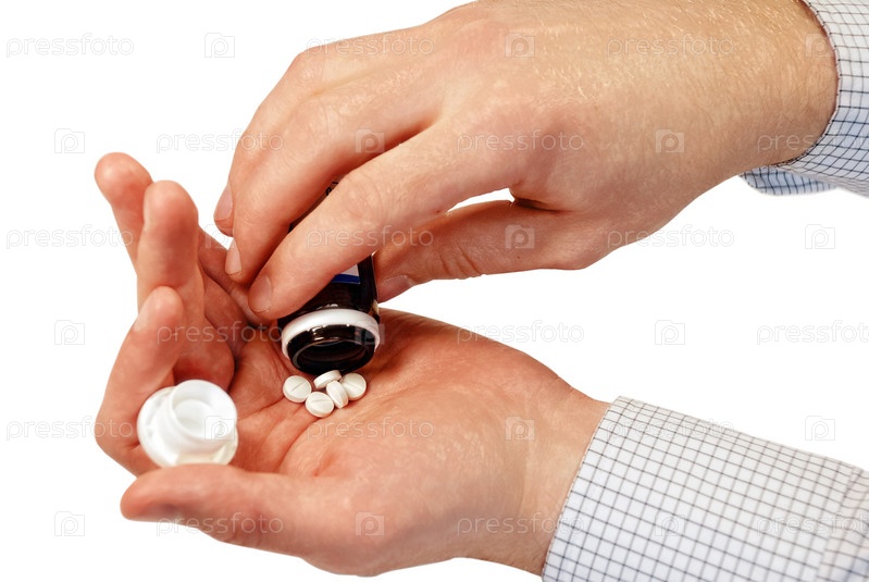 Таблетки в руке на белом фоне