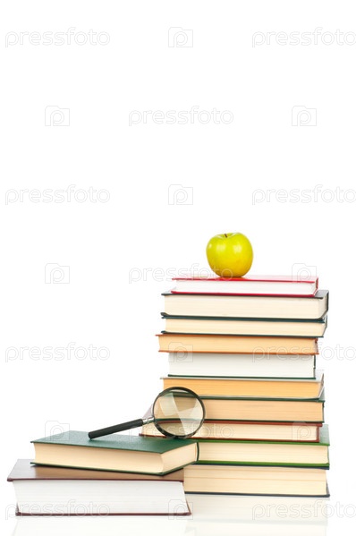 Стопка книг с яблоком и лупой