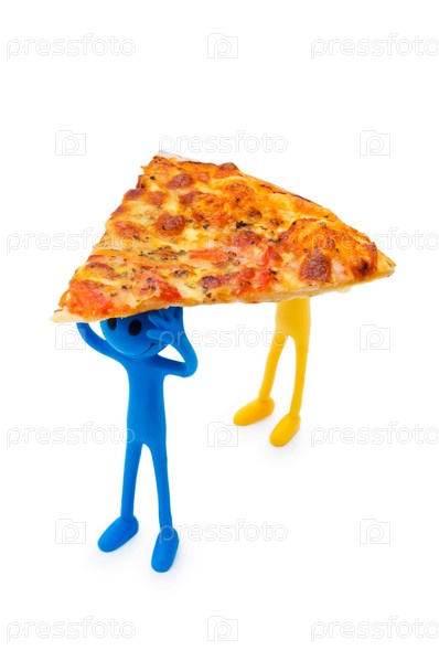 Кусочек пиццы несут маленькие человечки на белом фоне