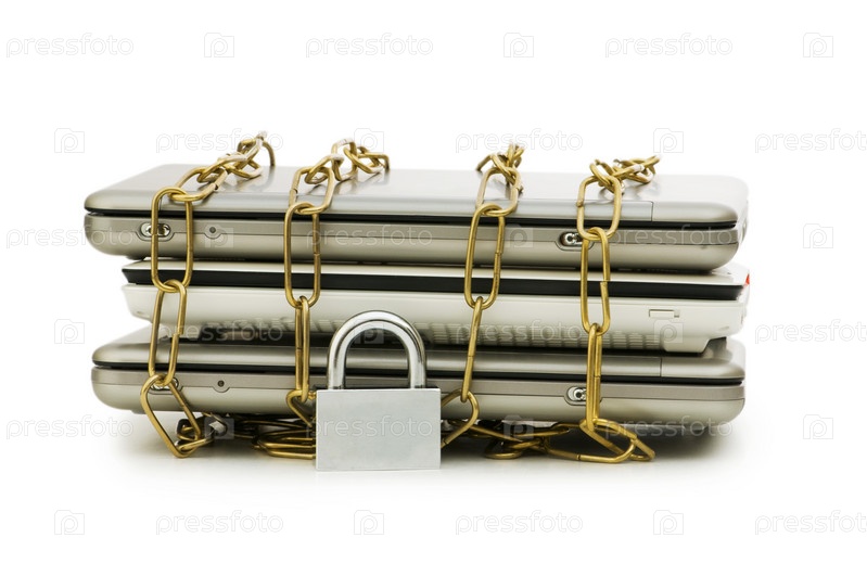Ноутбуки под замком, обмотанные цепью, изолированные на белом фоне