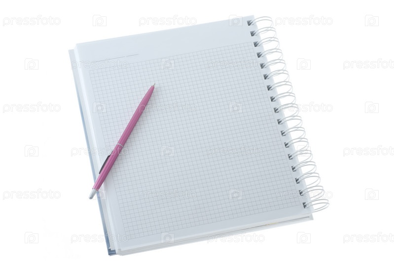 Розовая шариковая ручка на блокноте, изолированная на белом