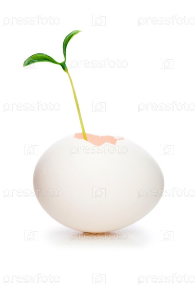 Зеленый росток в яичной скорлупе, изолированный на белом фоне
