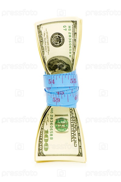 Долларовые купюры, стянутые сантиметровой лентой, изолированные на белом фоне