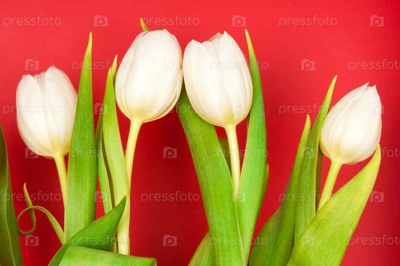 Белые тюльпаны на красном фоне