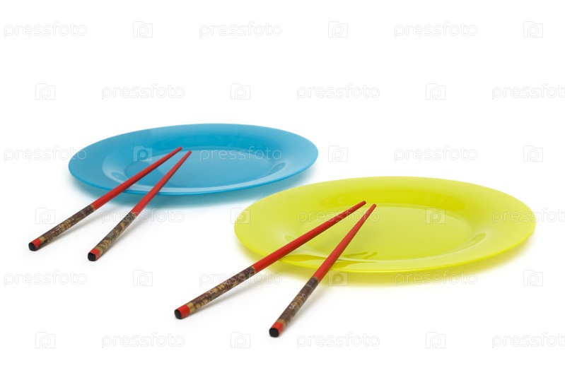 Пустые тарелки с китайскими палочками на белом фоне