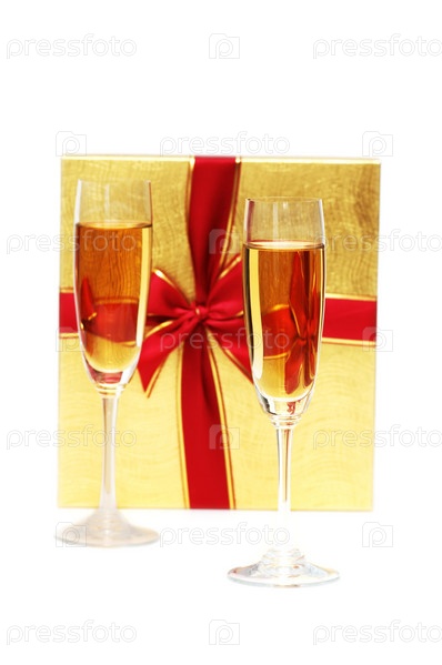 Два бокала вина на фоне подарка на белом фоне